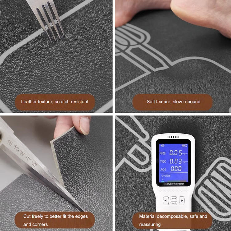 Disponible en varios tamaños, incluidos 40*60 cm, 40*120cm, 50*80 cm, 50*120cm, 50*150cm, 60*90cm y 60*160cm, o personalizado a sus necesidades, el tapete está elaborado con cuero premium PU. Este material no solo garantiza una apariencia elegante y moderna, sino que también cuenta con un peso sustancial de 2300 GSM, lo que lo hace excepcionalmente resistente y cómodo. Con un grosor de 4 mm, proporciona un amplio amonimiento bajo los pies mientras mantiene un perfil delgado que se ajusta a la perfección en cualquier decoración.